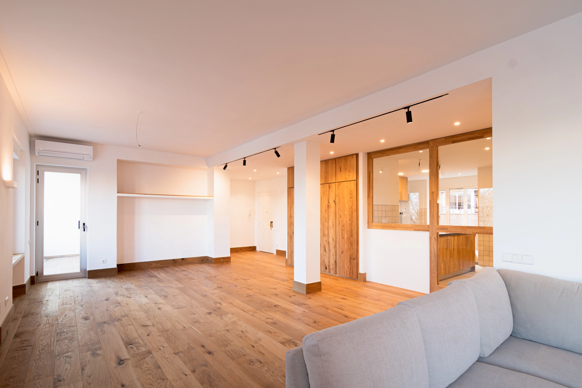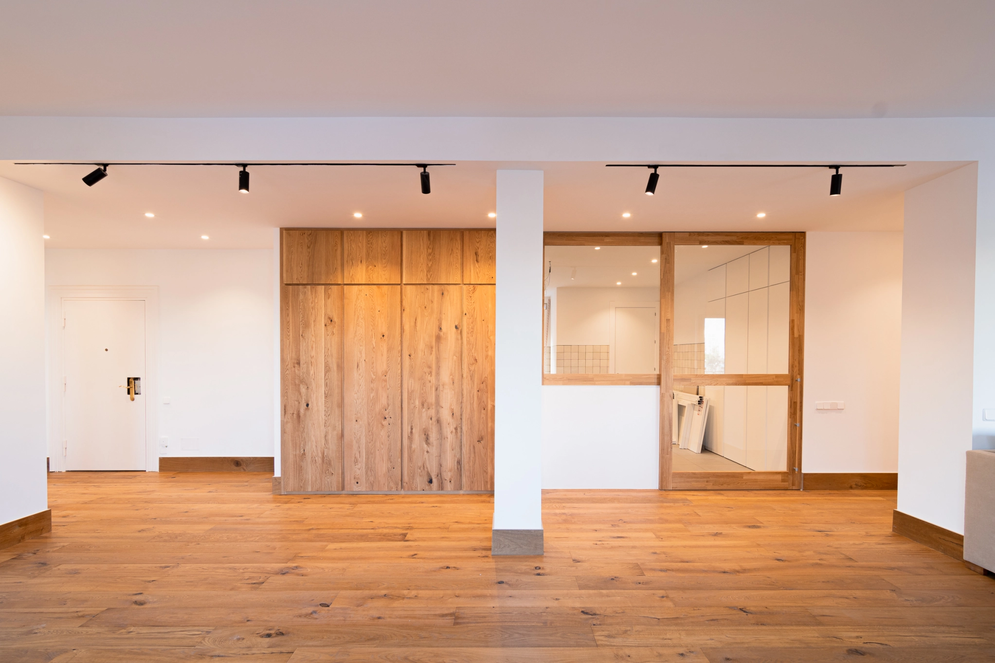 Planteamiento completo de la nueva distribución de la vivienda con la unión de espacios y aprovechamiento máximo de la luz natural. Amplitud de estancias y diseño personalizado de mobiliario y acabados.